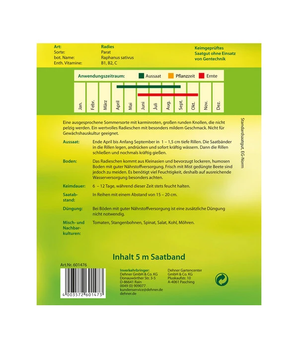 Die Saatscheiben und Saatbänder legen Sie einfach in die Erde. Eine ausführliche Aussaat-Anleitung für die jeweiligen Sorten finden Sie auf der Rückseite der einzeln verpackten Samen. Somit steht einer einfachen Aufzucht und Ernte nichts im Wege.