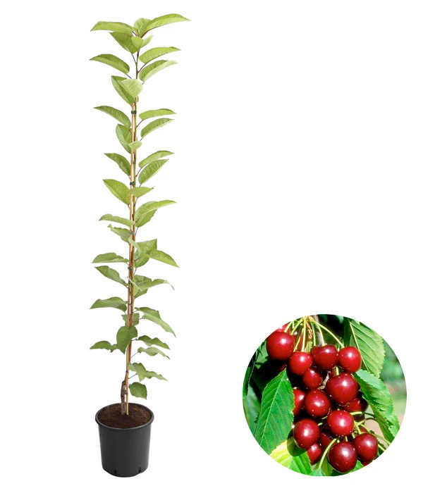 Der Kirschbaum kann in einem kleinen Garten oder im Vorgarten in den Boden gepflanzt werden, Sie können ihn aber auch in einem Topf auf dem Balkon kultivieren. Wichtig ist, dass Sie ihm in jedem Fall einen sonnigen bis maximal halbschattigen Standort geben, damit er reich blühen und viele süßaromatische Kirschen ansetzen kann. Um den säulenförmigen Wuchs des Obstgehölzes zu erhalten, empfehlen wir Ihnen einen regelmäßigen Rückschnitt der Seitentriebe auf 10-30 cm. Idealerweise sollte der Schnitt direkt nach der Ernte im Sommer erfolgen. Um die Wuchs- und Blühfreude zu der Säulenkirsche zu fördern, sollten Sie den Baum regelmäßig im Frühjahr mit etwas Obstbaumdünger versorgen.
