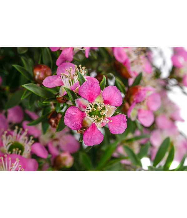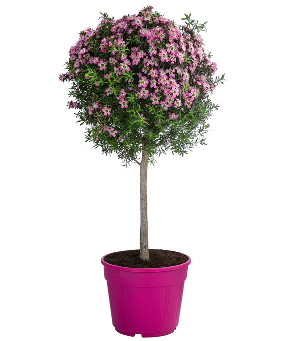 Vor allem im Sommer freut sich die Südseemyrte über viel Wasser und Sonne; am besten täglich. Auch Wärme ist dem Bäumchen zuträglich, es braucht aber nicht mehr als einen milden Frühling, damit es aufblüht. Dazu alle zwei Wochen ein wenig Dünger und Ihre Myrte trägt von April bis November kleine saftig-pinke Blüten. Darüber hinaus verzweigt sie sich von Natur aus sehr stark und lässt sich somit, am besten außerhalb der Blütezeit, in fast beliebige Formen schneiden. Zwar ist sie in geringem Maße winterhart, überwintert aber am besten, weiterhin feucht gehalten, an einem hellen, kühlen Plätzchen im Haus oder Wintergarten. Gönnen auch Sie Ihrem Heim ein Stück Südsee-Feeling und bestellen Sie die wunderschöne Südseemyrte sogleich.