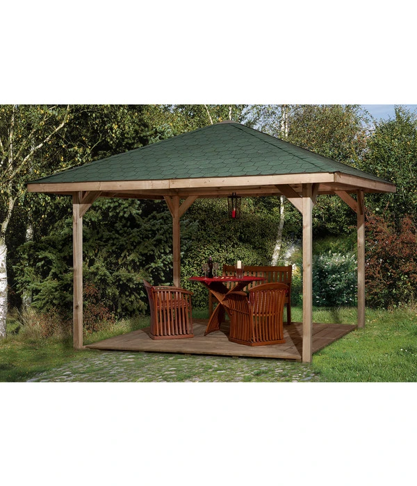 Sie wollen die Frühlings- oder Sommertage in Ihrem Garten genießen, dabei aber nicht stundenlang der Sonne ausgesetzt sein? Die Weka Gartenoase 651 A Gr. 1 ist dafür der perfekte Begleiter – den kompletten Frühling und Sommer lang. Die kleine Oase bietet aber nicht nur Schutz vor der Sonne sondern auch vor Regenschauern. So müssen Sie nicht ins Haus flüchten, sondern können die kleinen Schauer gemütlich draußen abwarten. Die Weka Gartenoase in Ständerbauweise ist mit einem naturbelassenen 19 mm Massivholzdach ausgestattet und kesseldruckimprägnierten Konstruktionshölzern. Der Boden ist nicht im Lieferumfang enthalten. Die Pfostenstärke liegt bei 120 x 120 cm. Dadurch wird für höchste Stabilität gesorgt – das gesamte Jahr lang! Das Dach ist mit einem hochwertigen Bitumen-Belag zur Ersteindeckung ausgestattet. Die Dachüberstände betragen je Seite ca. 38 cm, vorne und hinten ebenfalls 38 cm. Folgende Maße sind bei der Weka Gartenoase gegeben: Firsthöhe 314 cm, Traufhöhe 204 cm. Das Raumvolumen beträgt 31,98 m³.