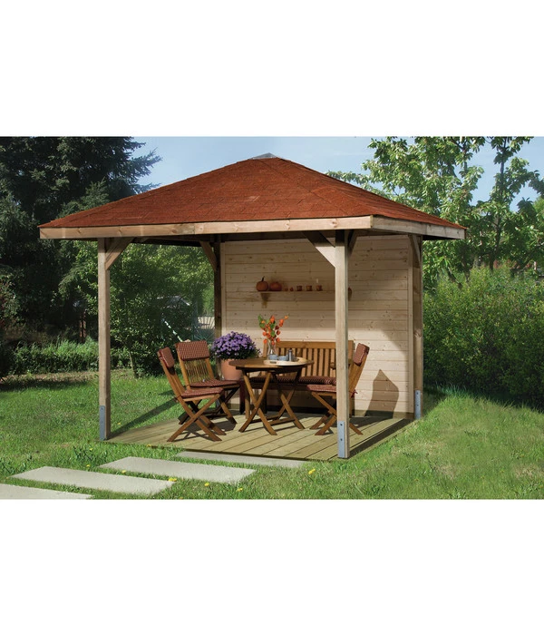 4-Eck Gartenoase 651 mit naturbelassenem 19 mm Massivholzdach, ohne Boden, Konstruktionshölzer kesseldruckimprägniert